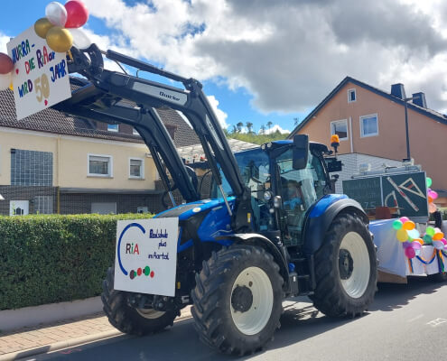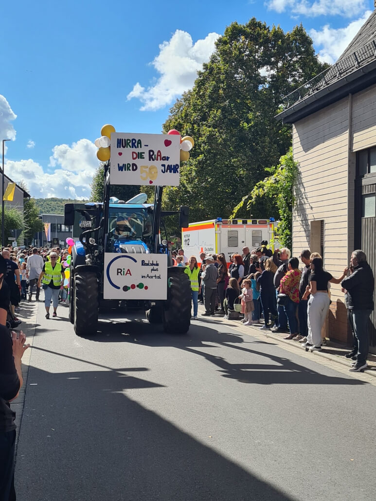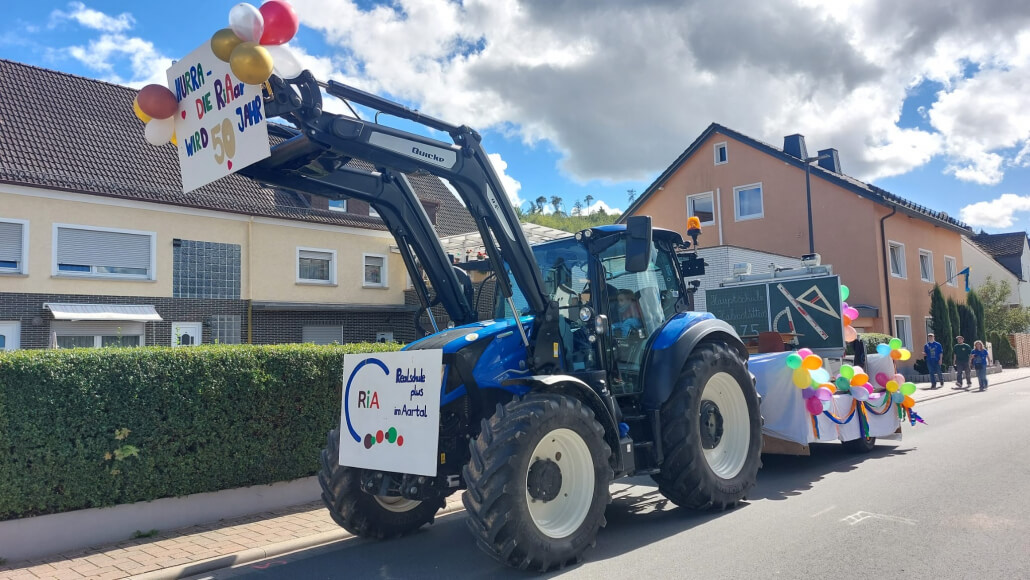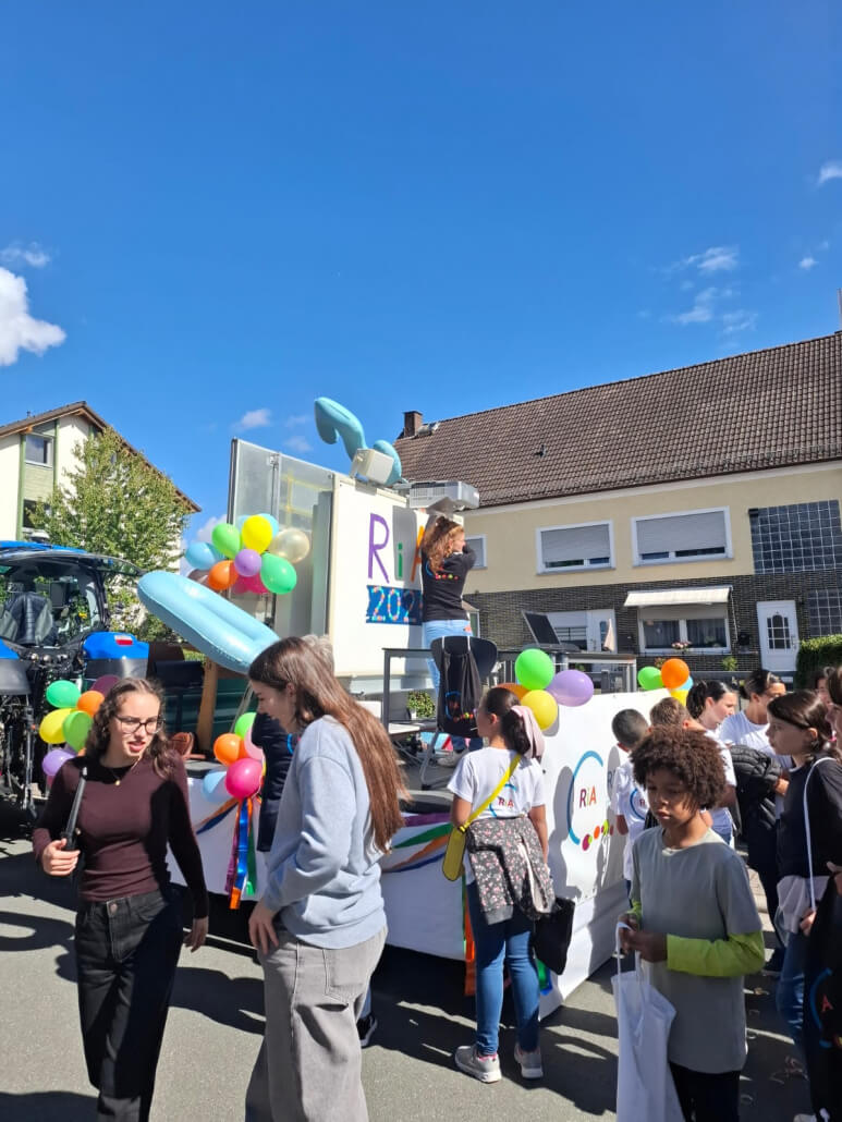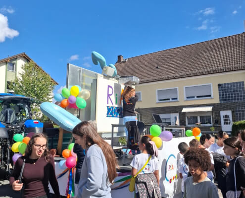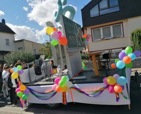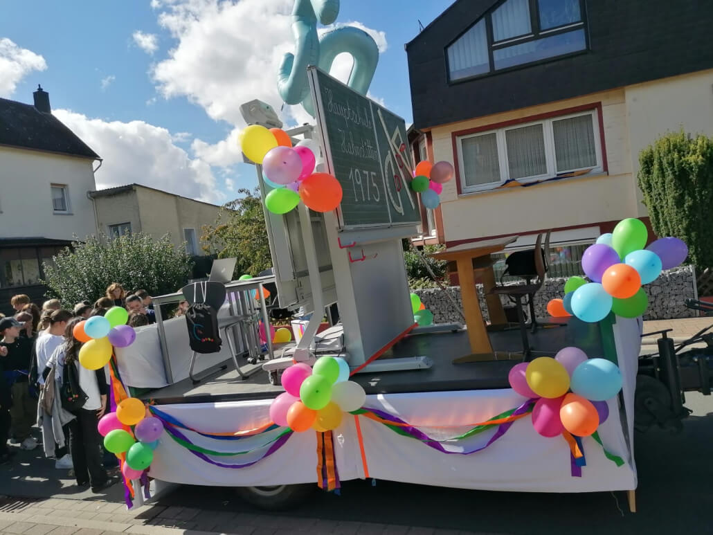 In diesem Jahr nahmen wir wieder mit einer bunt gemischten Gruppe aus Schülerinnen und Schüler der Klassen 5, 6 und 7 am Umzug des Hahnstätter Markts teil. Bei strahlendem Sonnenschein konnten unsere Kinder hinter einem toll gestaltetem Mottowagen anlässlich unseres Schuljubiläums laufen und die Menge begeistern.